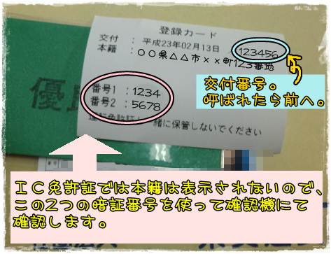 最後、IC免許証の確認機で先ほどの2つの暗証番号で確認し、終了。