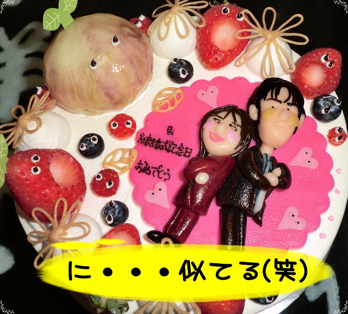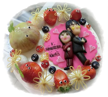 デコレーションケーキの上の部分は、ワタシとだんなちゃんの2人がいて、周りを果物に囲まれているというもの。